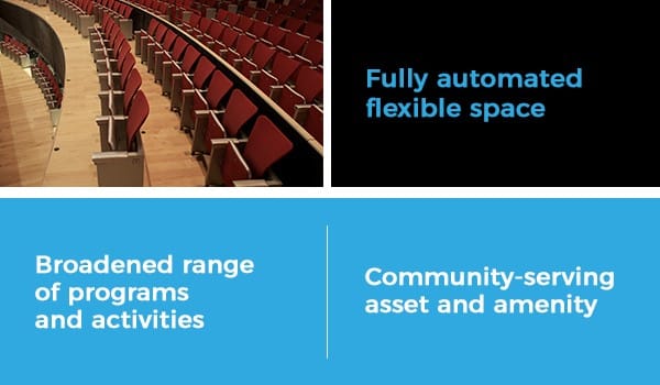 Recently published in Auditoria, A Welcome Change describes how flexible space has evolved in theaters. From temporary floors manually mounted on top of fixed wooden seating backrests in the 19th century to the traditional telescope and chair wagon conversion methods, flexible halls are nothing new. But in 2002, a novel independent row/lift system developed by Gala Systems – in which theater-style chairs could be raised to variable heights or concealed underneath the floor structure – made it possible for venues to switch between multiple configurations in just minutes.