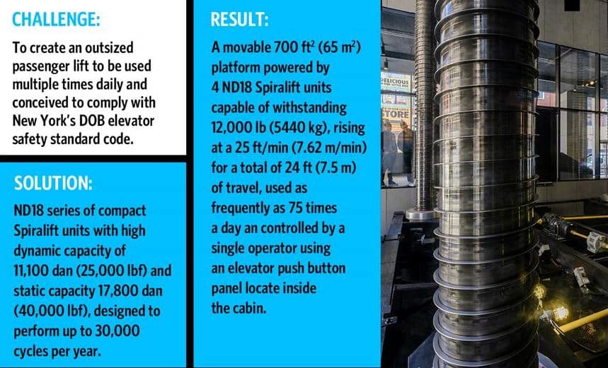 Recently, Spiralift actuators have been used in an outsized passenger lift, one of the largest in the world, at the New York SPYSCAPE Museum. This innovative lift transports 50 visitors at a time to the museum’s exhibition level in a slow three-minute ascent, during which time they are shown a video briefing as part of the introduction to the museum experience.